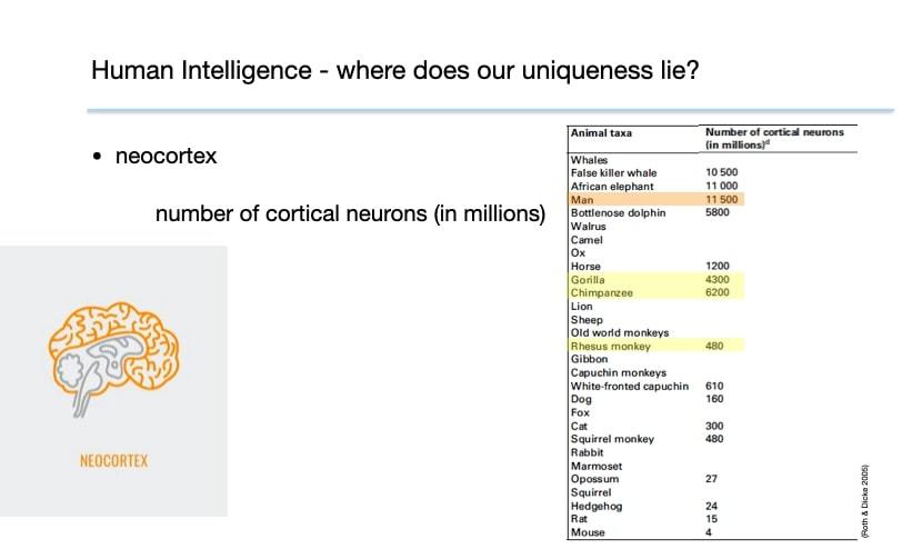 It may seem natural to say our brains can function the way they do because of their size, although sperm whales and elephants have larger brains than humans. Dolphins are pretty close to humans in brain size, but intelligent as dolphins are, they haven’t managed to colonize an entire plant. Instead, the advantage our brains have is in the number of cortical neurons, as outlined in the chart provided by Dr. López-González. In so many words, our brains can “fire” at a higher density versus other animals, which explains why we are capable of such high levels of creative and intellectual thought. It also explains why, as humans, we can think on the fly better than machines can.