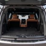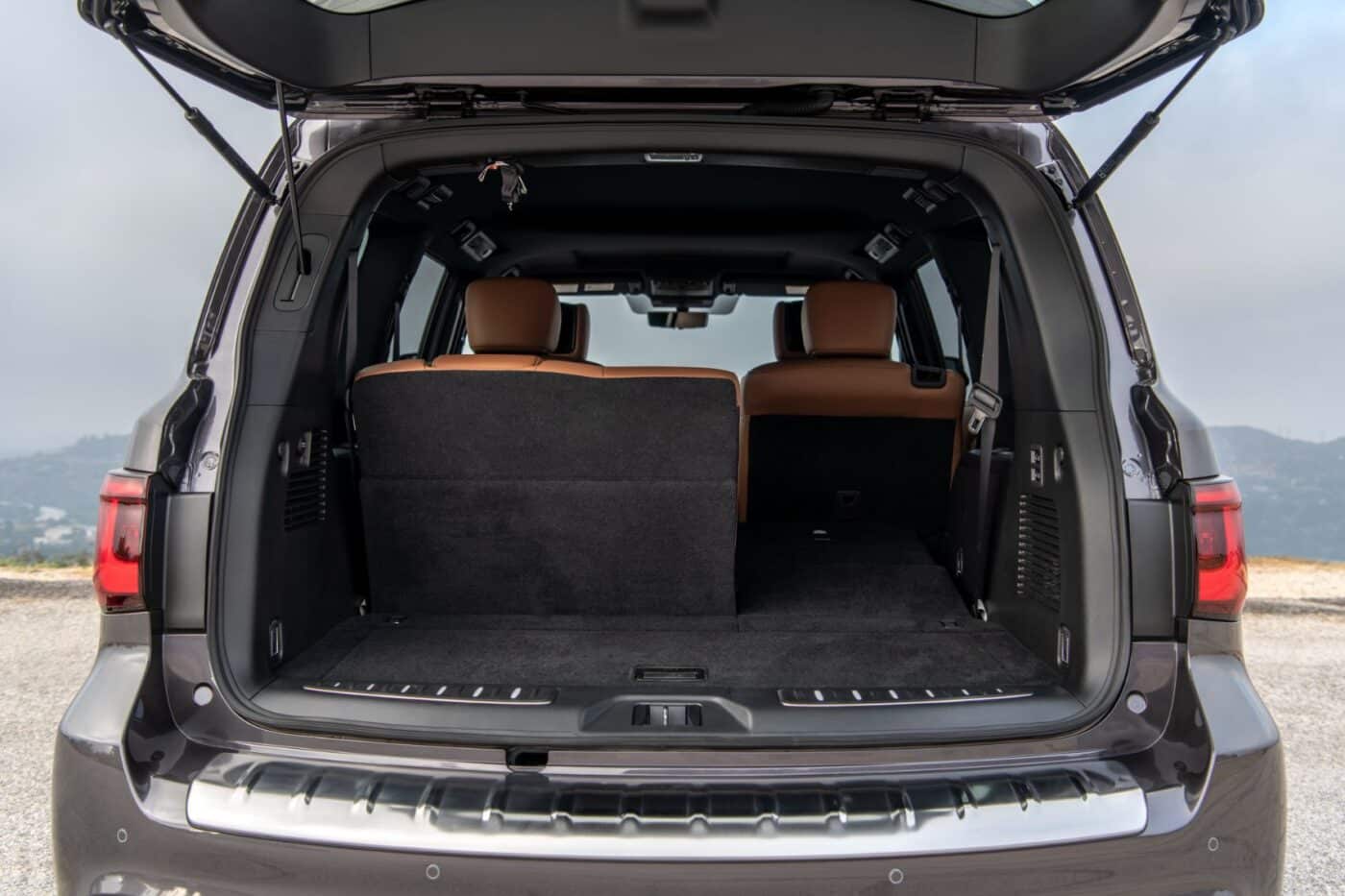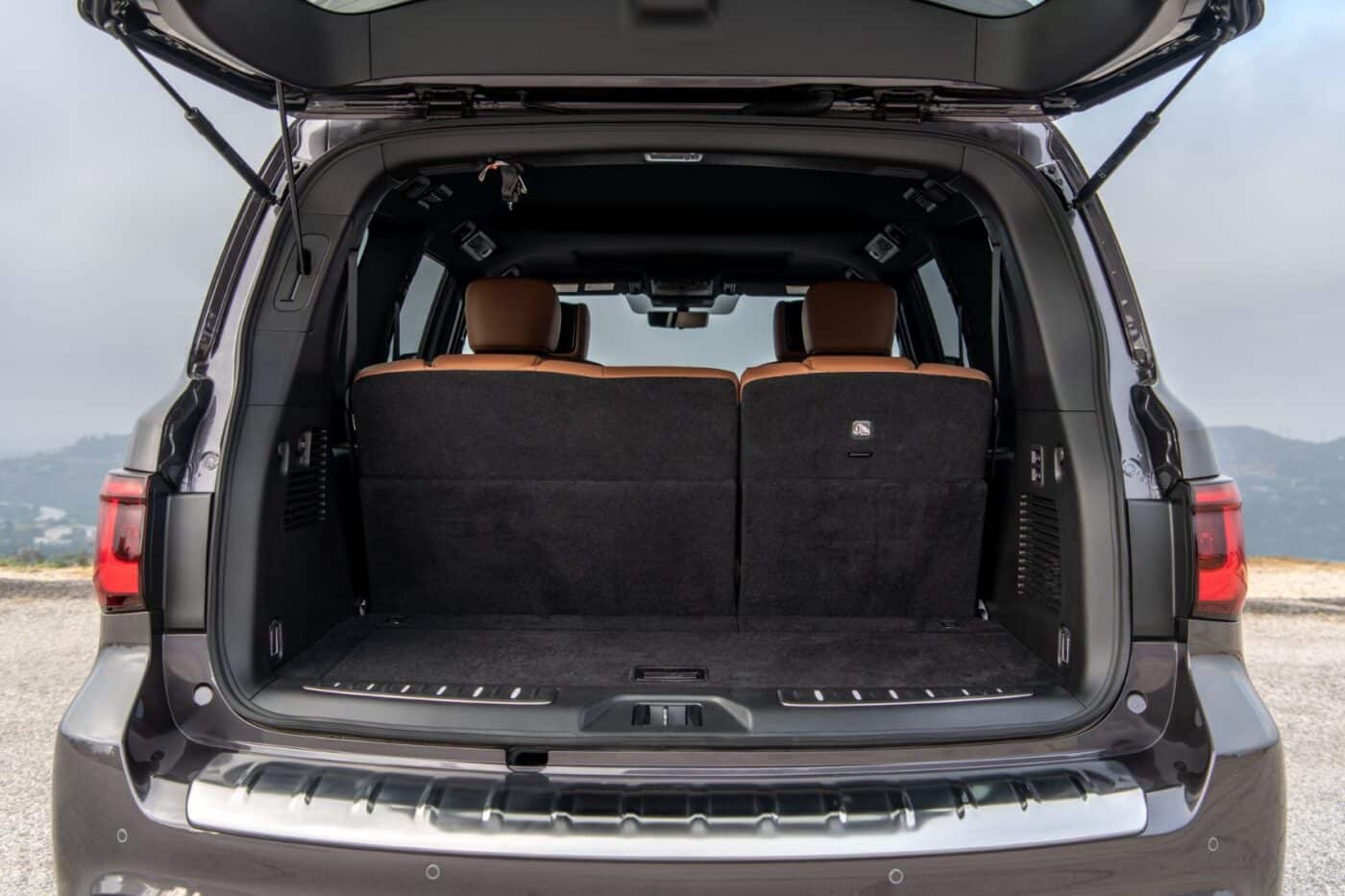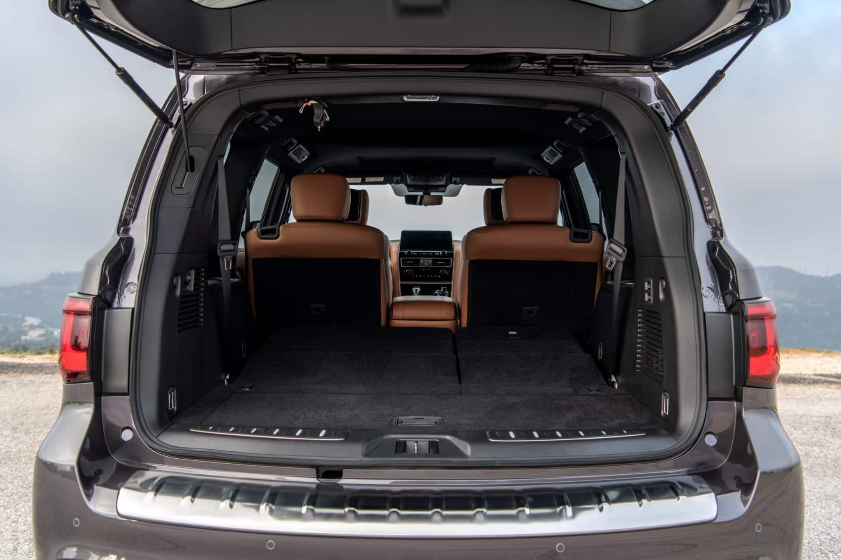 Behind the third row, the QX80 offers 16.6 cubic feet of cargo space. Fold the third row down for a total of 49.6 cubic feet of cargo space. With both the second and third rows folded, the total cargo space is 95.1 cubic feet. Total passenger volume is 152.5 cubic feet. To help with the loading and unloading of cargo and gear, the 2023 QX80 is standard with a power liftgate.