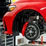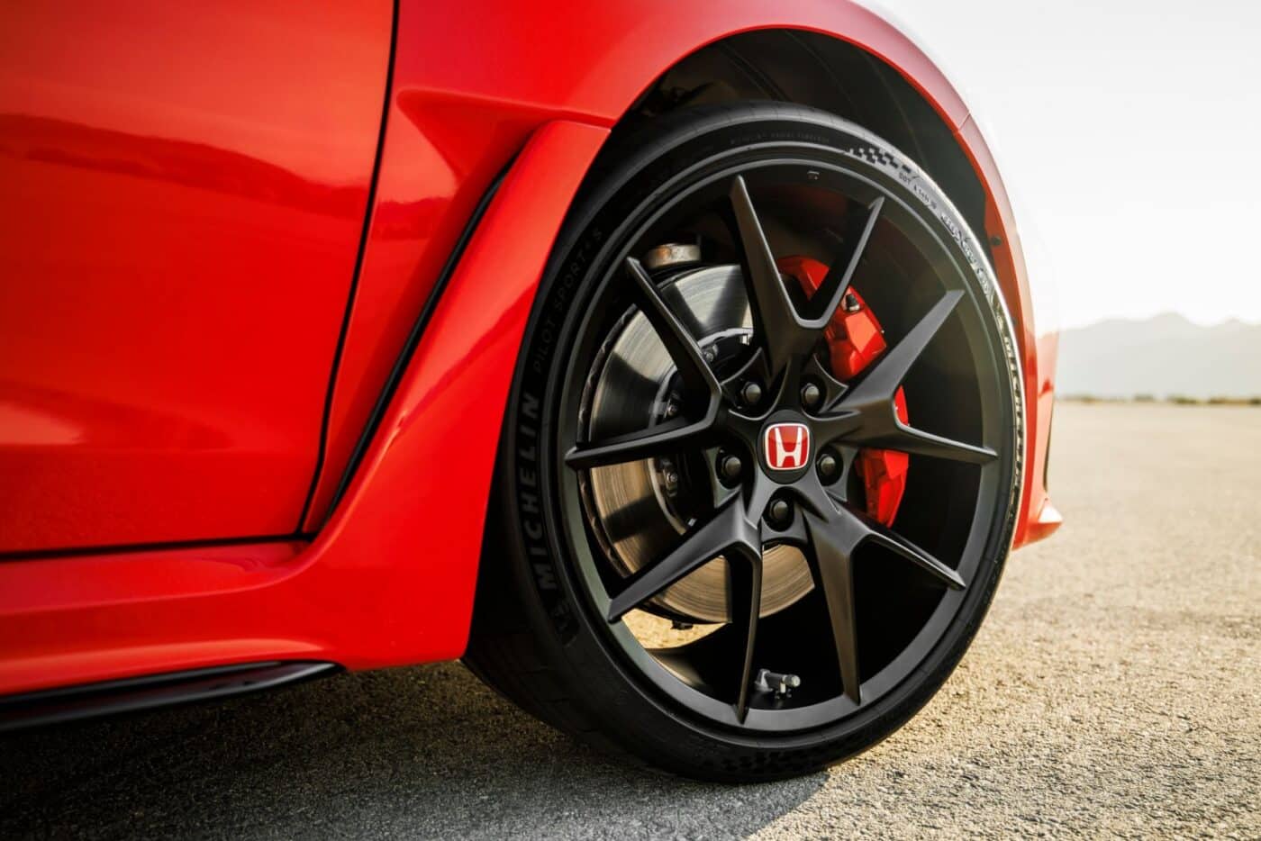 The 2023 Honda Civic Type R has a 1.4-inch longer wheelbase than the Civic Hatchback. Moreover, it has a wider track (front and rear) and a more rigid architecture. It’s also 0.8-inches longer and half an inch lower to the ground than the plebian Civic Hatchback. Suspending the powertrain, driveline, and chassis is a reconfigured dual-axis strut front and multilink rear suspension that Honda promises will offer better steering and straight-line stability. Meanwhile, the anchors are two-piece front rotors and a retuned brake booster to provide better braking stamina when the going gets hot.
