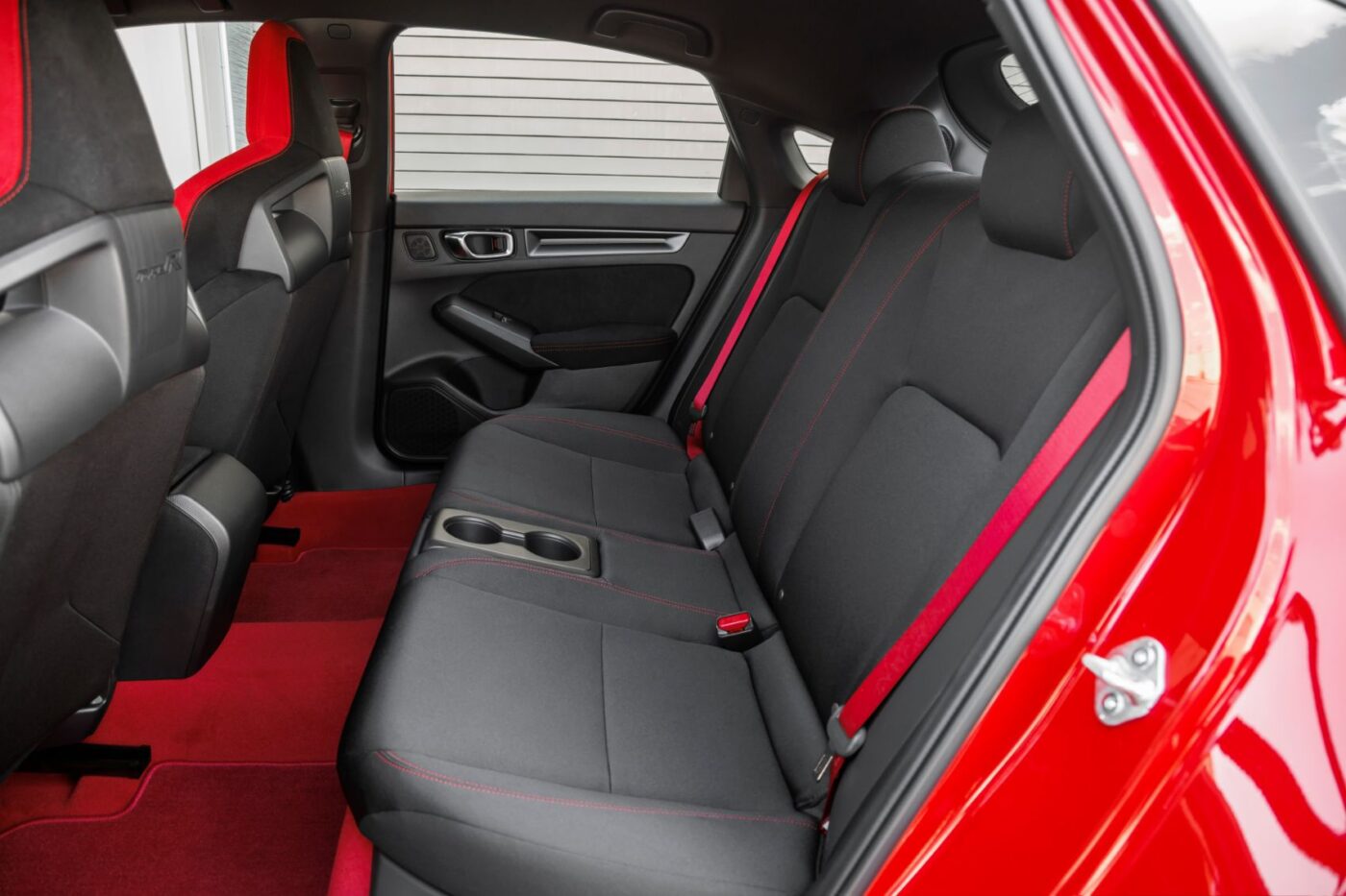 Inside the 2023 Honda Civic Type R are new body-stabilizing, heavily-bolstered front sport seats wrapped in a suede-like upholstery to keep your love handles stable when attacking corners. The driver can access a revised digital instrument cluster with multiple display options. Of course, the instrument panel features a large tachometer, a gear-position display, and a second meter for the R+ driving mode.