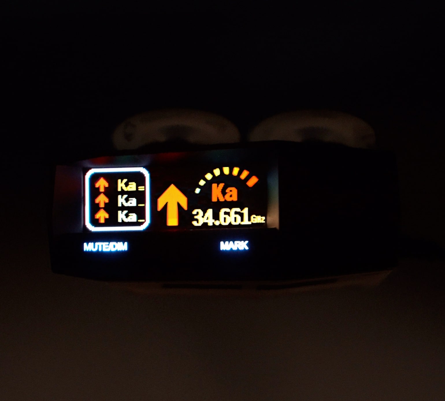 With the All Threat feature turned on via the settings menu, the R8 will simultaneously detect up to four radar bands, showing each of them visually on the OLED display. The strongest signal is designated as the priority and will appear front and center, like in the photo above.