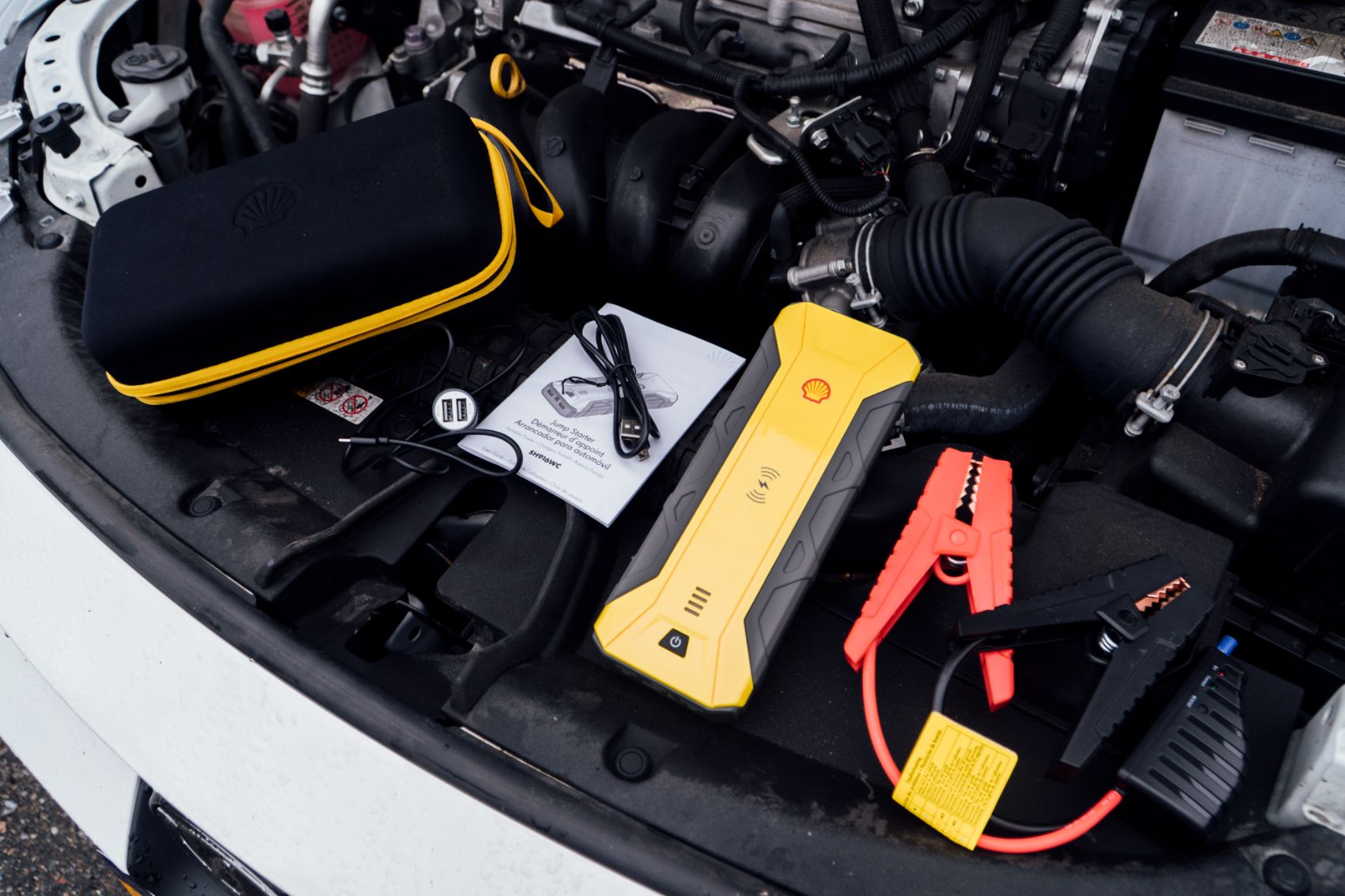 The 1200A Shell Portable Jump Starter comes with jumper cables, a car charger (2.4A output), one USB-A to Micro USB cable, one Type-C to Type-C USB cable, an owner’s manual, and a carrying case.