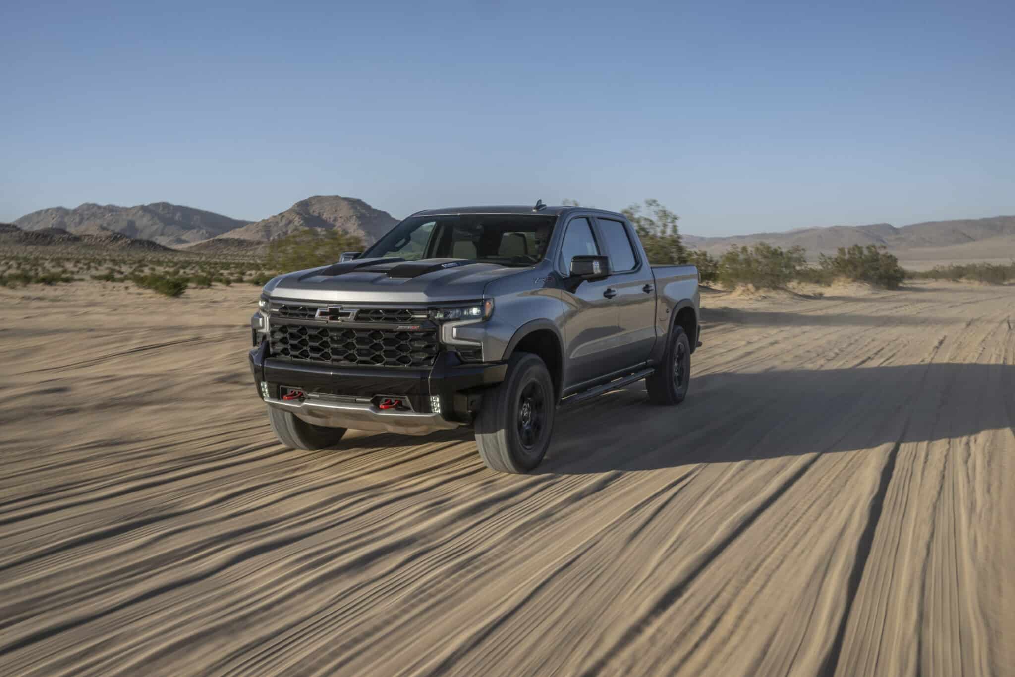 The ZR2 has bespoke features to reflect its off-road character, like a lifted suspension with Multimatic DSSV dampers, hill descent control, two-speed transfer case, locking front and rear differentials, reinforced skid plates, and chunkier 33-inch all-terrain tires. The Silverado ZR2 Bison offers even more off-road capability.
