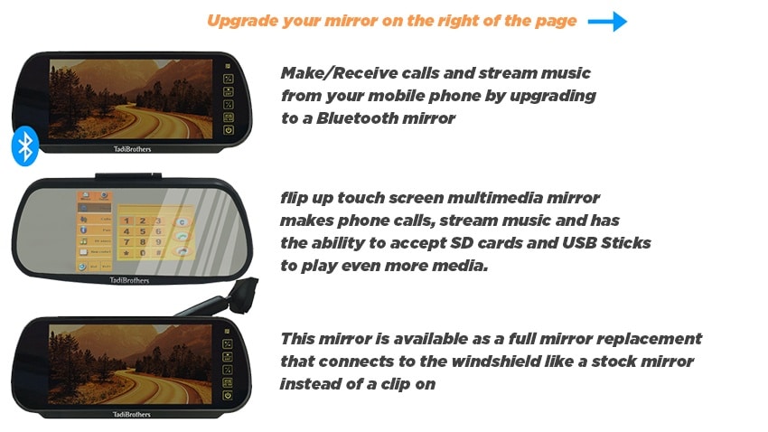 Unlike a traditional OEM backup camera, systems from TadiBrothers can be configured to activate only while in reverse or stay on the entire time. To maximize the functionality of the latter configuration, consider adding a front camera. The seven-inch rearview mirror screen has a second channel with RCA inputs, meaning it will accommodate a second camera on a continuous feed.