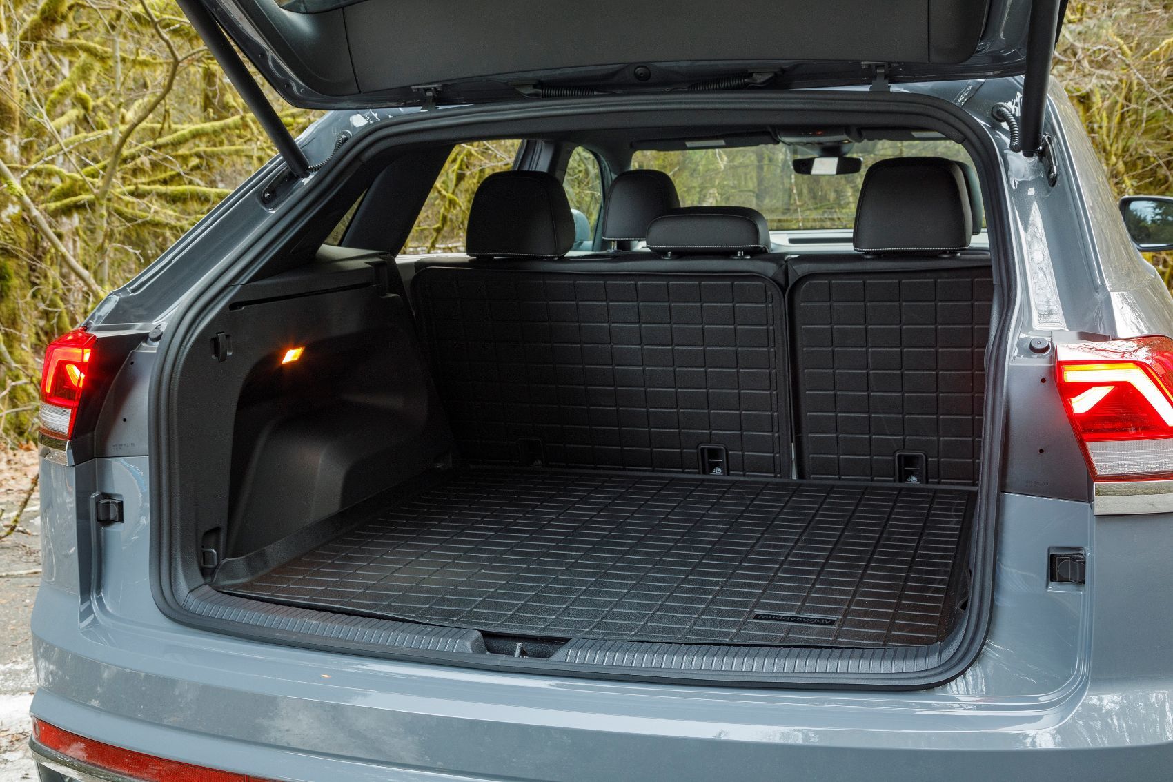 The SE with Technology R-Line comes standard with the larger V6 engine. It also adds dark gray 20-inch wheels, restyled bumpers and lower door trim, and more sporty interior accents. Our Atlas Cross Sport came with a hands-free tailgate, remote start, and a power outlet for good measure.