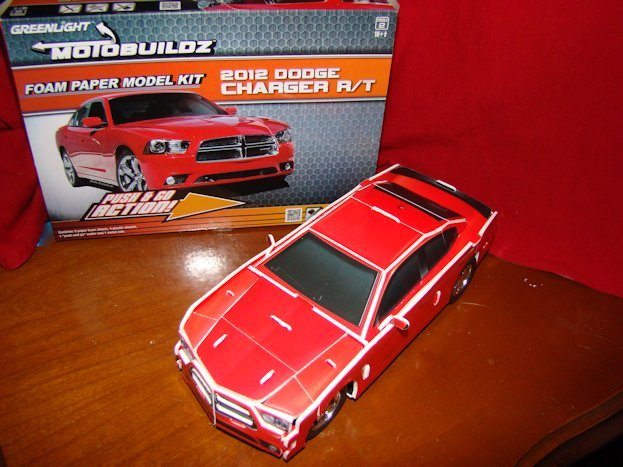 In writing this product review as a proposed car gift idea, I took time to build a Greenlight MotoBuildz kit myself. Obtaining a 2012 Dodge Charger R/T, the assembly process took me about an hour to complete. The age rating seems a little high but there are a few metal parts involved. The instructions on the box are rather straightforward but be careful to observe the small details in the description to minimize frustrations. I really impressed with the result of a foam paper representation of the Dodge Charger sedan. Constructing the kit’s base first, the 26 total components go together quickly. Foam parts are layered on the front and rear fascia area of the vehicle to create a meaningful 3-D effect depicting bumpers as well as grille detail. When it comes to the aesthetics of the MotoBuildz kit, the side mirrors fall short and are applied as almost an afterthought. Another aspect somewhat annoying was the front axle rod jostles back and forth. Some kind of stopper would have been appreciated on the front metal axle rod.
