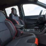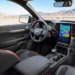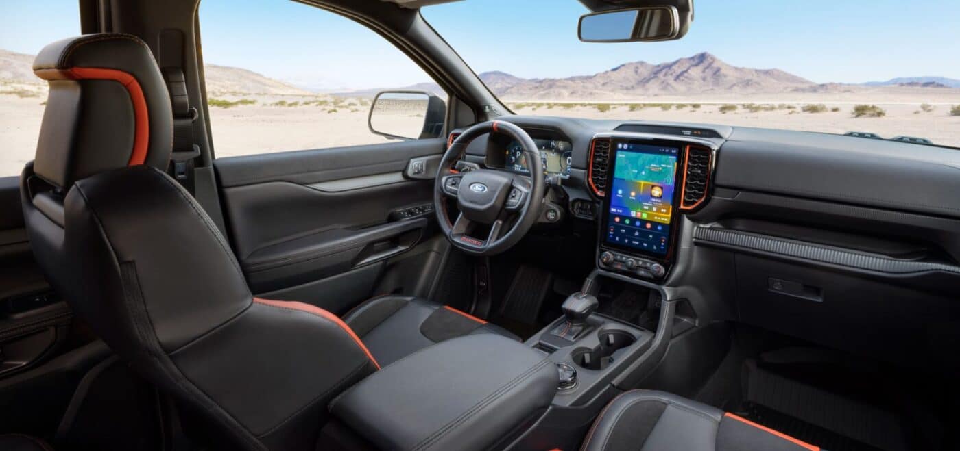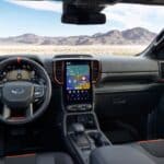 The 2024 Ford Ranger Raptor is hard to miss with its steel front bumper, standard 17-inch wheels, 33-inch BFGoodrich KO3 all-terrain tires, C-clamp driving lights, bulbous fenders, and protective steel skid plates. Meanwhile, the cabin includes a sporty steering wheel, magnesium paddle shifters, Ford Performance front seats, and code orange trim. Furthermore, the Ranger Raptor has overhead console switches to enhance the big rig experience.