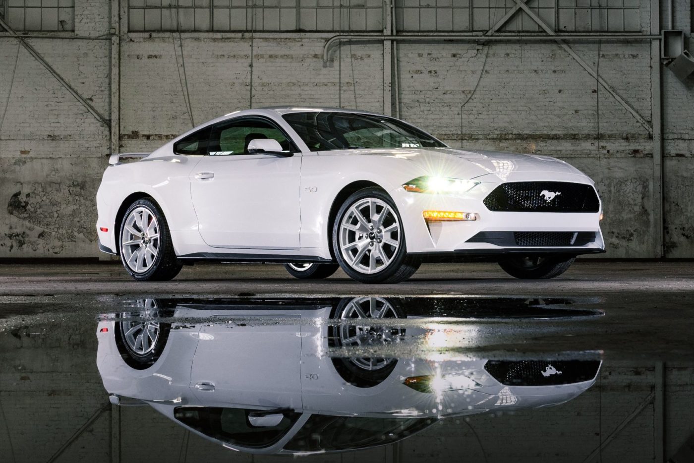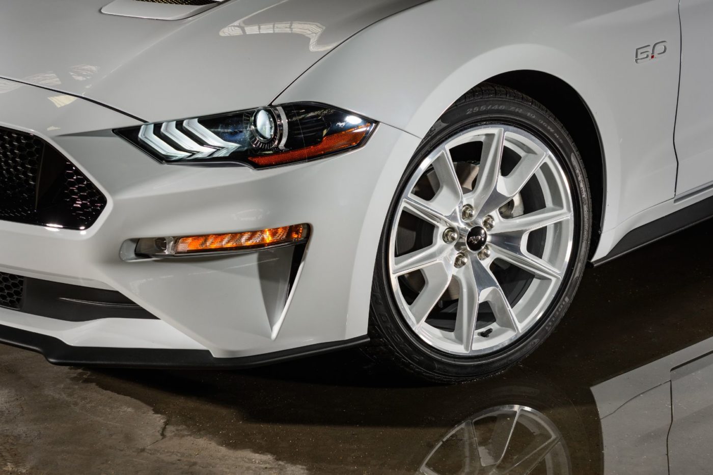 Available for the EcoBoost and GT Premium fastback, the Mustang Ice White Edition is an eye-catching Oxford White from top to bottom. Reminiscent of the 1993 Triple White Fox Body Mustang, this modern pony rides on 19×9-inch wheels in matching Oxford White with machine-surfaced pockets. A sleek black and white combo resonates throughout the interior, complete with accent stitching on the center console, door panels, shifter boot, and headrest.