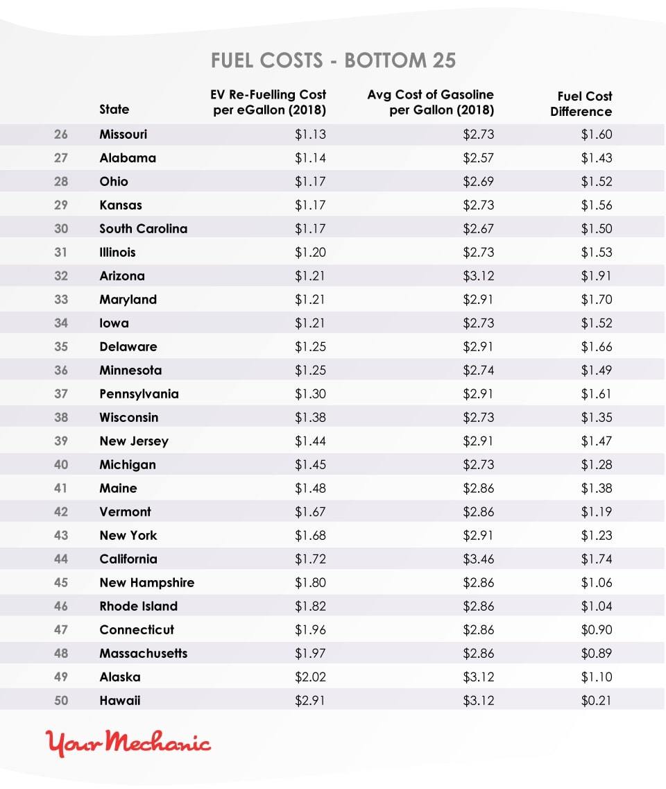 California was also near the bottom, relative to other states, with regard to fuel costs. Average EV fueling cost per e-gallon is $1.72, which lands The Golden State at 44.