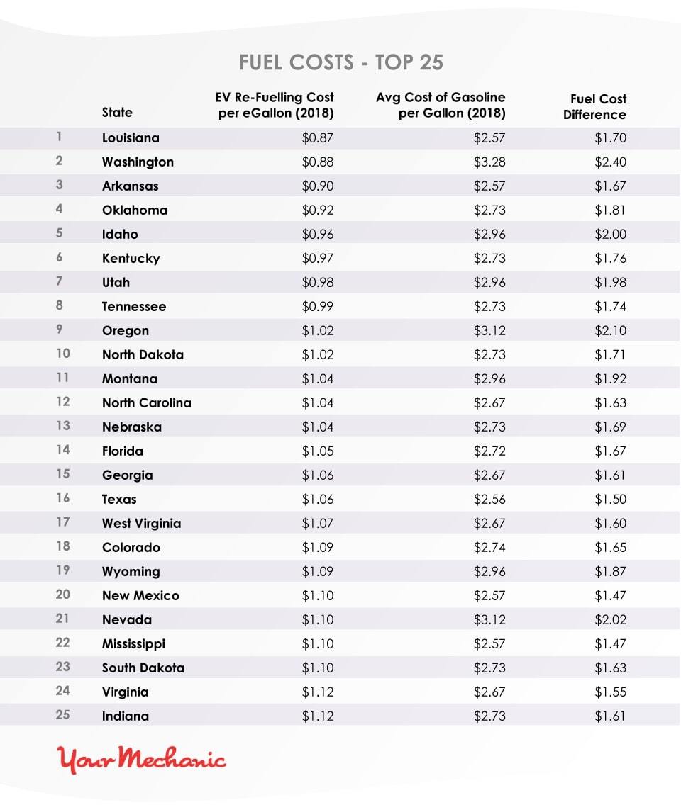 The study also looks at the cost of juicing up your EV versus filling your tank. Louisiana is one of the top states for EV owners on this metric. There you save $1.70 per gallon over dino-juice. Washington comes in second (saving you a total of $2.40), but that has more to do with Washington’s amazingly cheap electricity (all that rain runs into a whole bunch of rivers that have a huge number of hydroelectric dams).