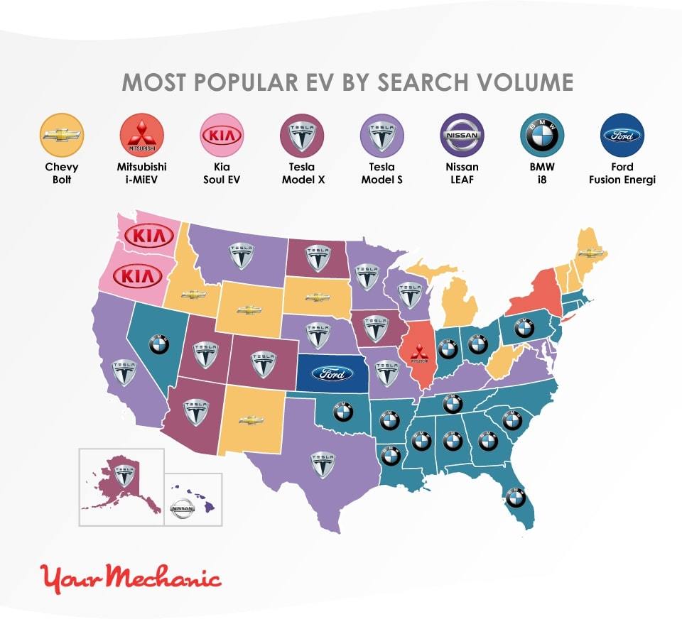 YourMechanic also broke down brand popularity by state, and that was interesting too. No, it wasn’t Tesla across the board. Tesla is the king in only 12 states, leading the way in California naturally. Interestingly, in Oregon and Washington, the Kia Soul EV is number one. What’s interesting are the outlier states. The only place that likes the Ford Fusion Energi? Kansas. The only place that likes the Mitsubishi i-MiEV? Illinois. Strange.