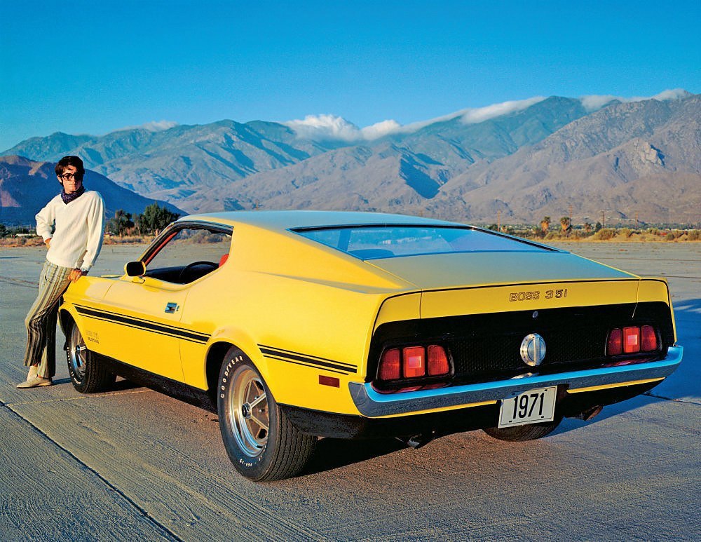 Evidence indicates that this yellow 1971 Boss 351 started out as a Boss 302, possibly 1F02G100053, before the decision was made to discontinue the small displacement Boss Mustang. The car was used for a series of publicity photos. The “5” and “1” on the decals appear to have been retouched to revise the “302” lettering to “351.” Ford Motor Company Photo
