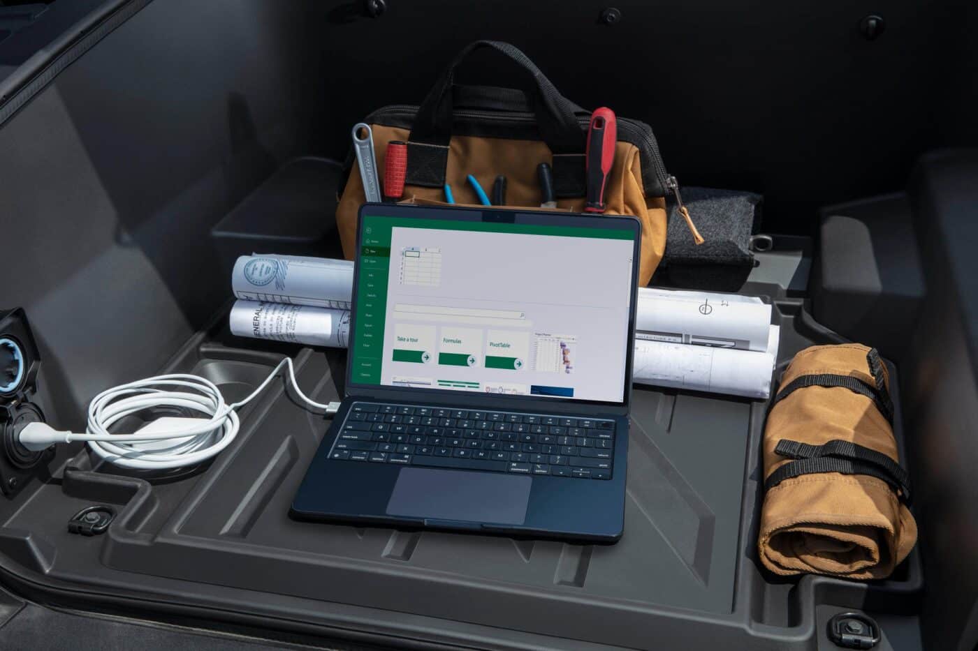 Inside, the 2024 Chevy Silverado EV has a modular seven-gallon console, a fixed glass roof, and 40/60 split-folding second-row seats. In addition, the optional power bar accessory offers up to 10 outlets, enabling you to tap into the truck’s batteries to power hand tools, camping accessories, and small appliances on the go. You can even charge another stranded EV!