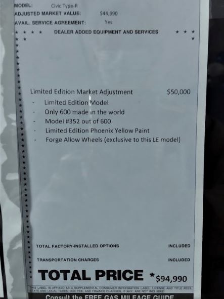 This Honda dealer has had a 2021 Civic Type R Limited Edition in its showroom since at least May of 2021. In May, the ADM was $25,000. Six months later, still not sold, the ADM for this same car has doubled to $50,000. Is this a marketing strategy? We are less than a month away from the calendar year 2022; this 2021 Civic Type R is growing old as it sits. Honda has announced that there will be a 2022 Type R, but it’s not out yet, and there’s no word about a Limited Edition.