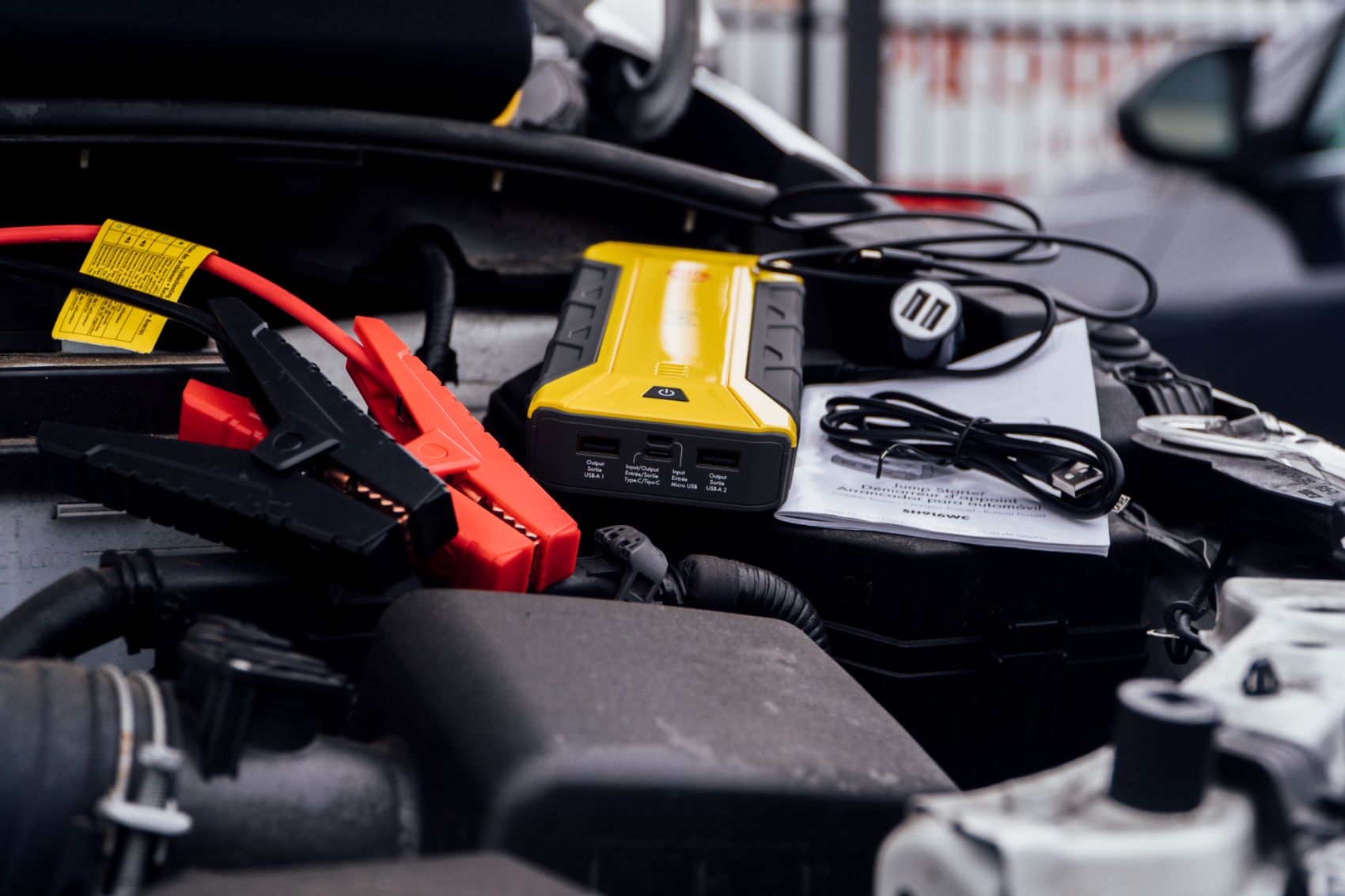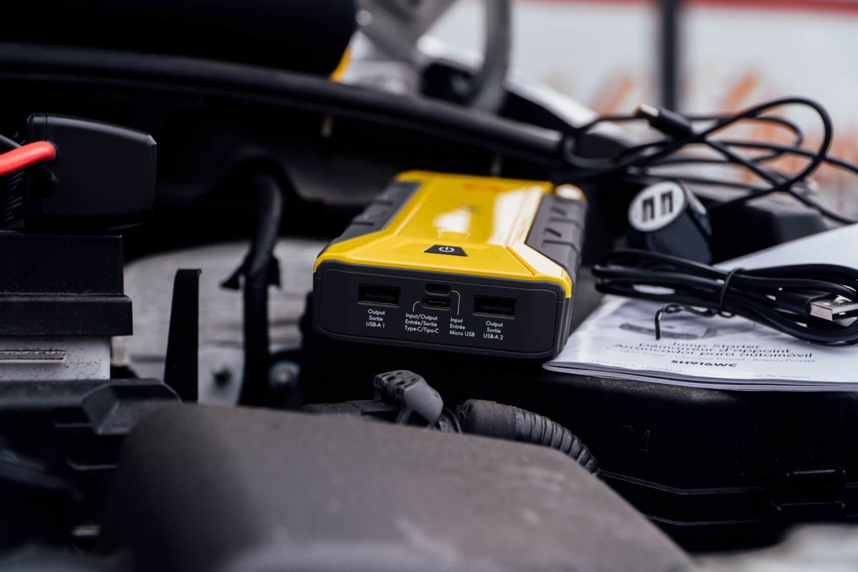The 1200A Shell Portable Jump Starter comes with jumper cables, a car charger (2.4A output), one USB-A to Micro USB cable, one Type-C to Type-C USB cable, an owner’s manual, a product warranty registration card, and a carrying case.